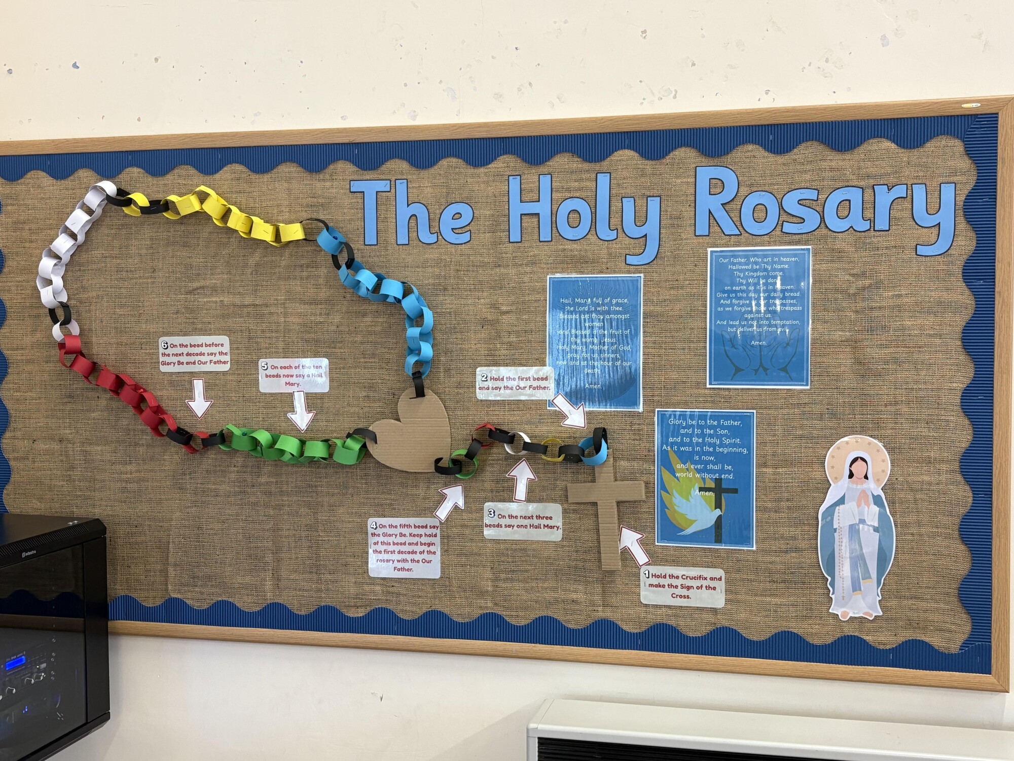 The Rosary: With Mary as the patroness of our school, praying the Rosary is very special to us. The Rosary is a special set of prayers using beads. Each bead helps us remember to pray certain prayers, like the "Hail Mary" and "Our Father", and to think about the important times in Jesus' and Mary's lives.